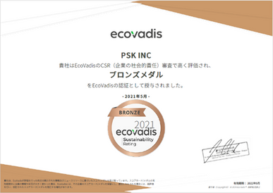 ピーエスケー株式会社は国際的な評価機関であるEcoVadis社によるサステナビリティ(持続可能性)評価において2年連続で「ブロンズ」評価を獲得しました。「ブロンズ」評価は全ての評価対象企業・団体のうち、上位35%の企業に対する格付けです。
